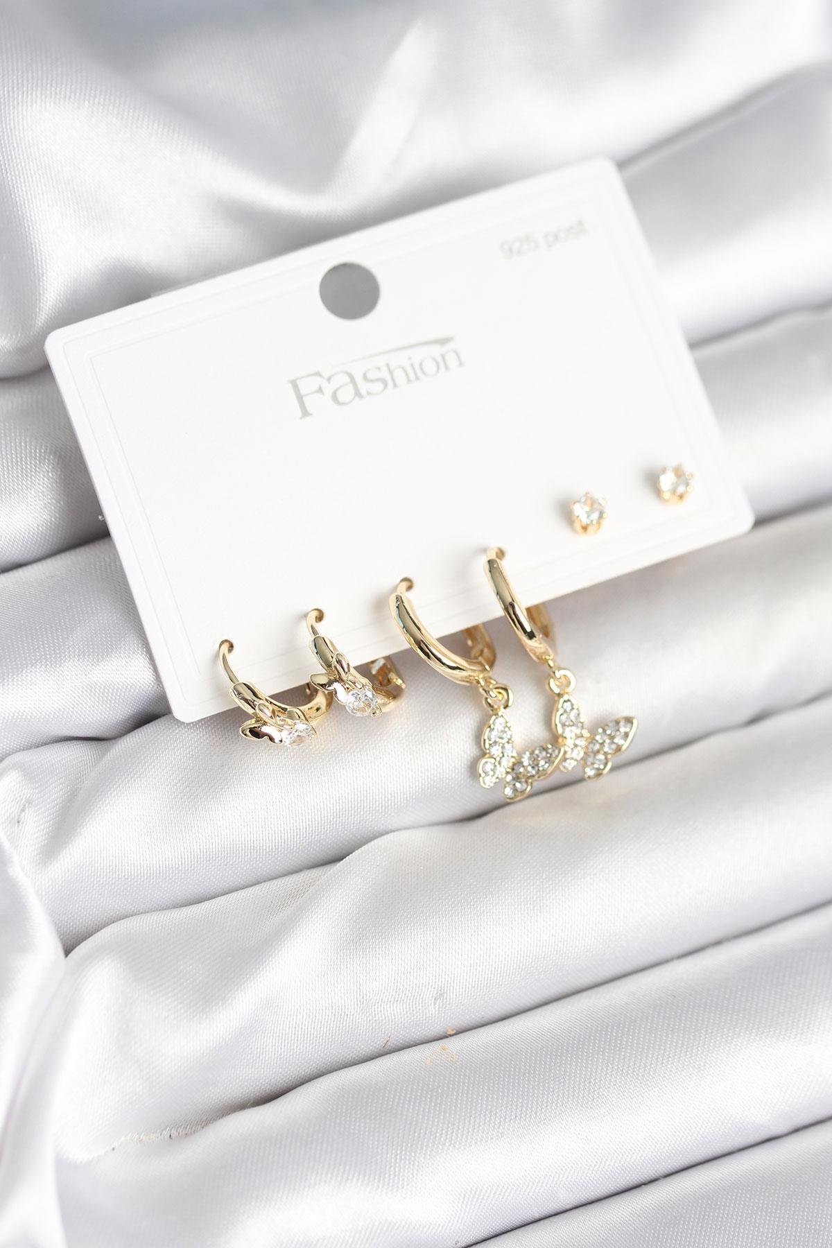 Gold Renk Pirinç Kelebek Model 925 Ayar Gümüş Çivili Kadın Küpe Seti