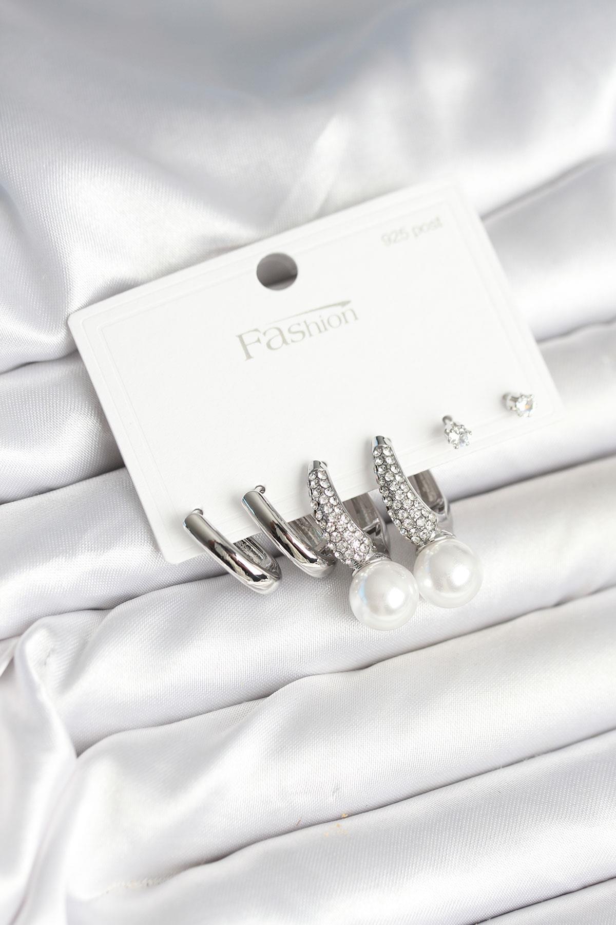 Pirinç Gümüş Renk İncili 925 Ayar Gümüş Çivi Kadın Küpe Seti (BKP11251)
